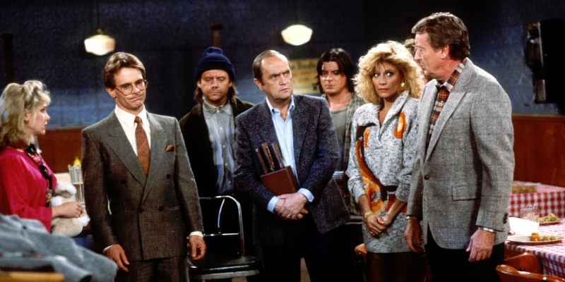 Newhart drew a lot of genteel humor from Bob Newhart’s eternally deadpan reactions to the oddballs and strange situations around him; season seven, episode 21, opens with Vermont inn owner and how-to manual author Dick Loudon (Newhart) receiving his author copies of his first attempt at a mystery—Murder at the Stratley. Several of the locals point out that the fictional Stratley Inn sounds a lot like the inn Dick and his wife Joanna (Mary Fran) run, the Stratford (“Especially the ‘Strat’ part.”). Dick insists that the innkeepers in his mystery, “Rick” and “Johanna,” aren’t based on anyone (even though Joanna and “Johanna” even share the same hometown), and the book’s handyman “Jorge” should not be seen as inspired by the Stratford’s handyman George (Tom Poston). Joanna is especially upset to read of “Johanna’s” brutal murder—at “Rick’s” hands!—on page six, leaving “Rick” free to pursue the seductive town librarian. Needless to say, the actual town librarian, Ms. Goddard (Kathy Kinney) thinks the book is terrific, though it makes her wonder about Dick (who, unlike “Rick,” doesn’t seem at all interested in her). When Joanna leaves town to visit her mother, the staff of the Stratford confront Dick with their suspicions that he has killed and dismembered his wife, as described in the book—and evidence keeps turning up supporting this. At the same time, Dick’s accusers keep asking him to provide refreshments, becoming even more critical of him when he refuses, and finally causing him to shout “The next time I murder my wife I’ll order a deli platter!” Joanna’s sudden return doesn’t even let Dick off the hook, as the attending cop Officer Shifflett (played by Todd Susman, who played a very similar role on the Golden Girls murder mystery episode) is now convinced that Dick probably has a murdered wife somewhere in his past—maybe he’s wondering what happened Suzanne Pleshette, Newhart’s wife from his previous sitcom.